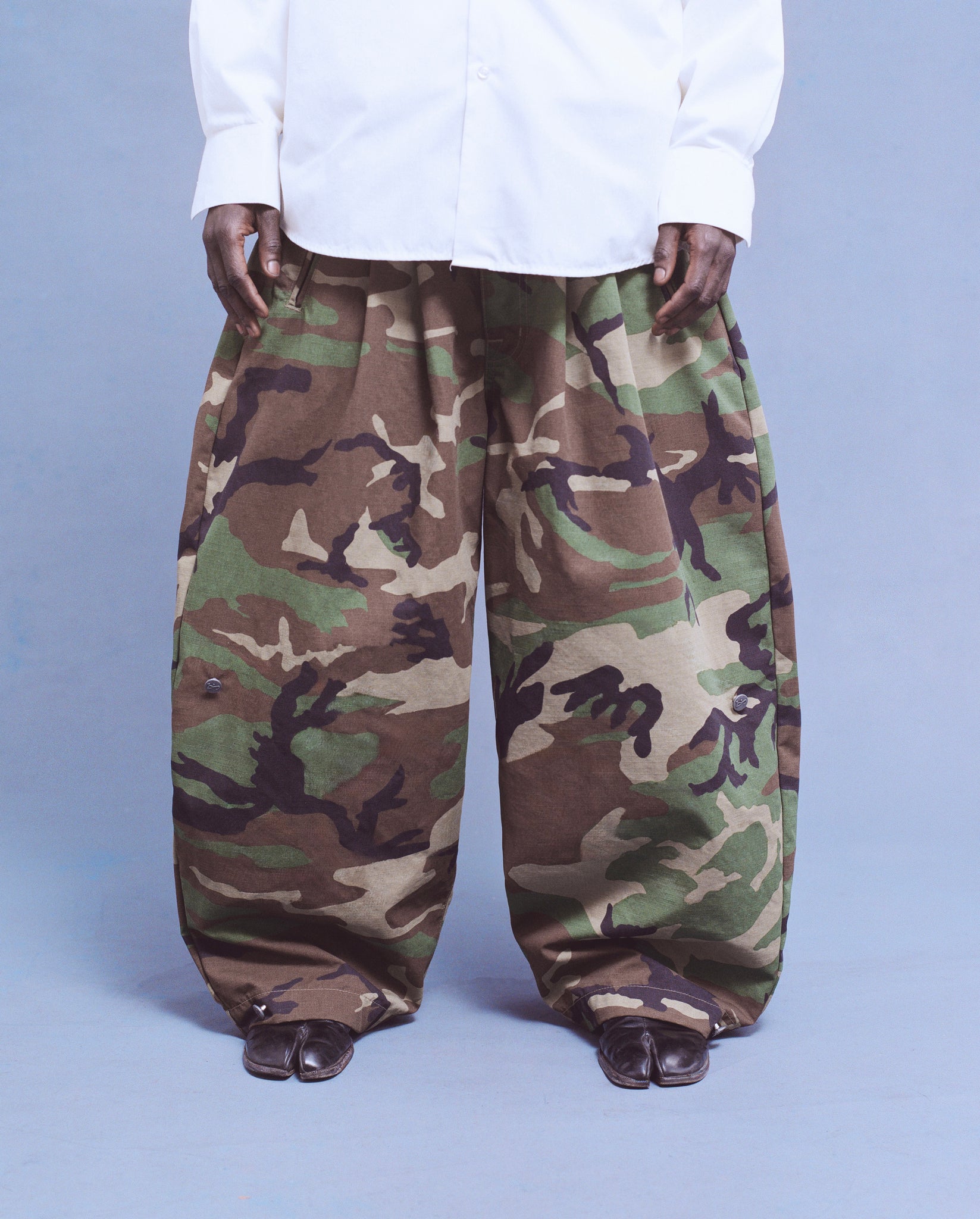 Our Camo Japanese Twill Pant is cut and sewn in Los Angeles. It is designed to have 3+ styles in one pant.